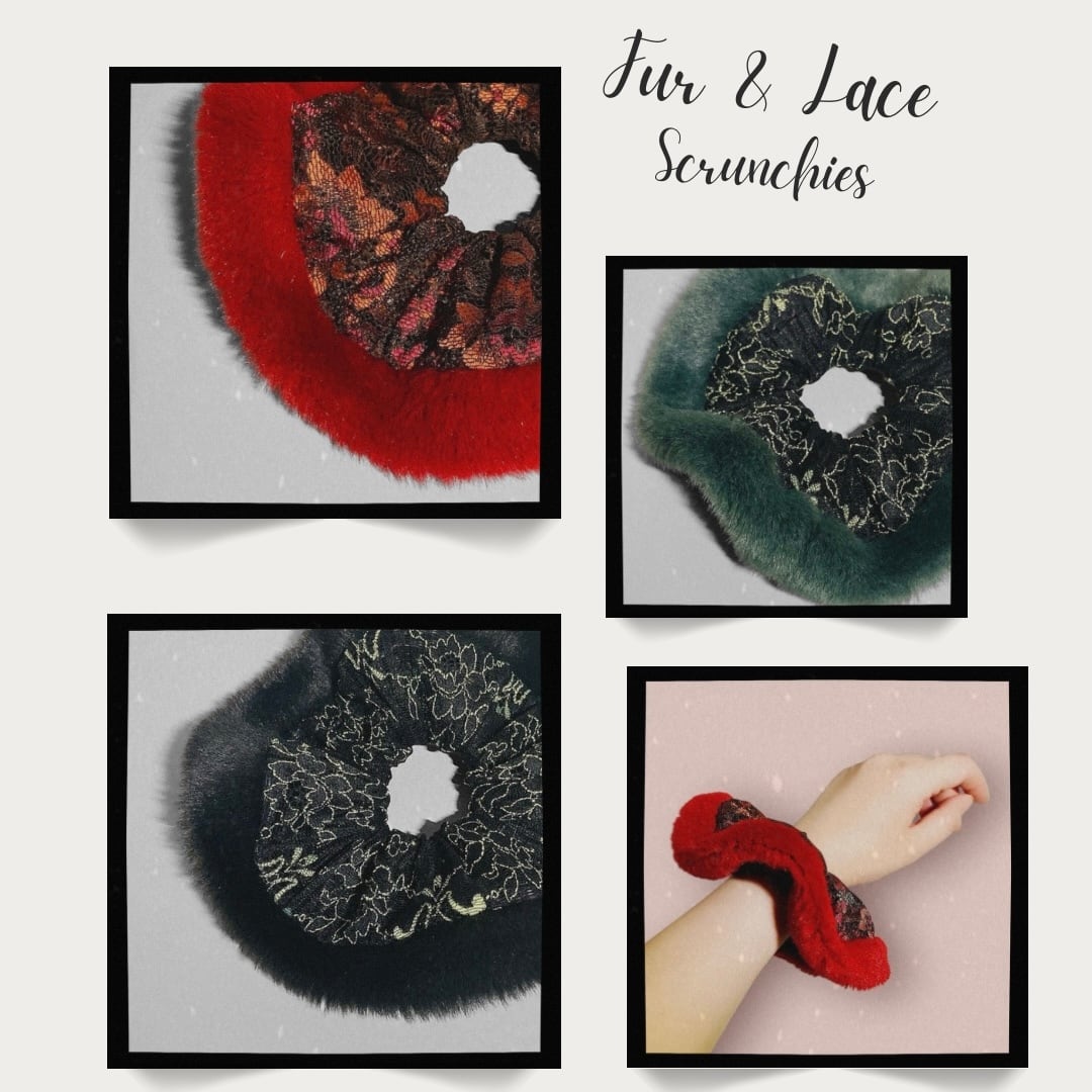 【シュシュ レース×フェイクファー】〈グリーン×ブラック〉
