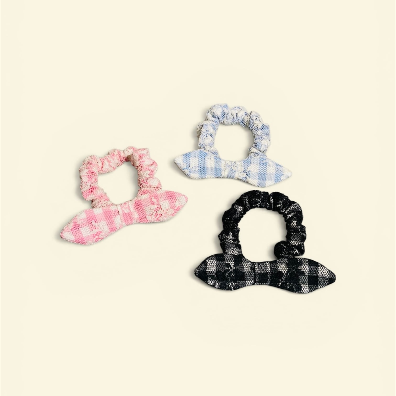 ギンガムチェックに花柄のレースを重ねて。小ぶりのリボンがついたロマンティックなシュシュです。