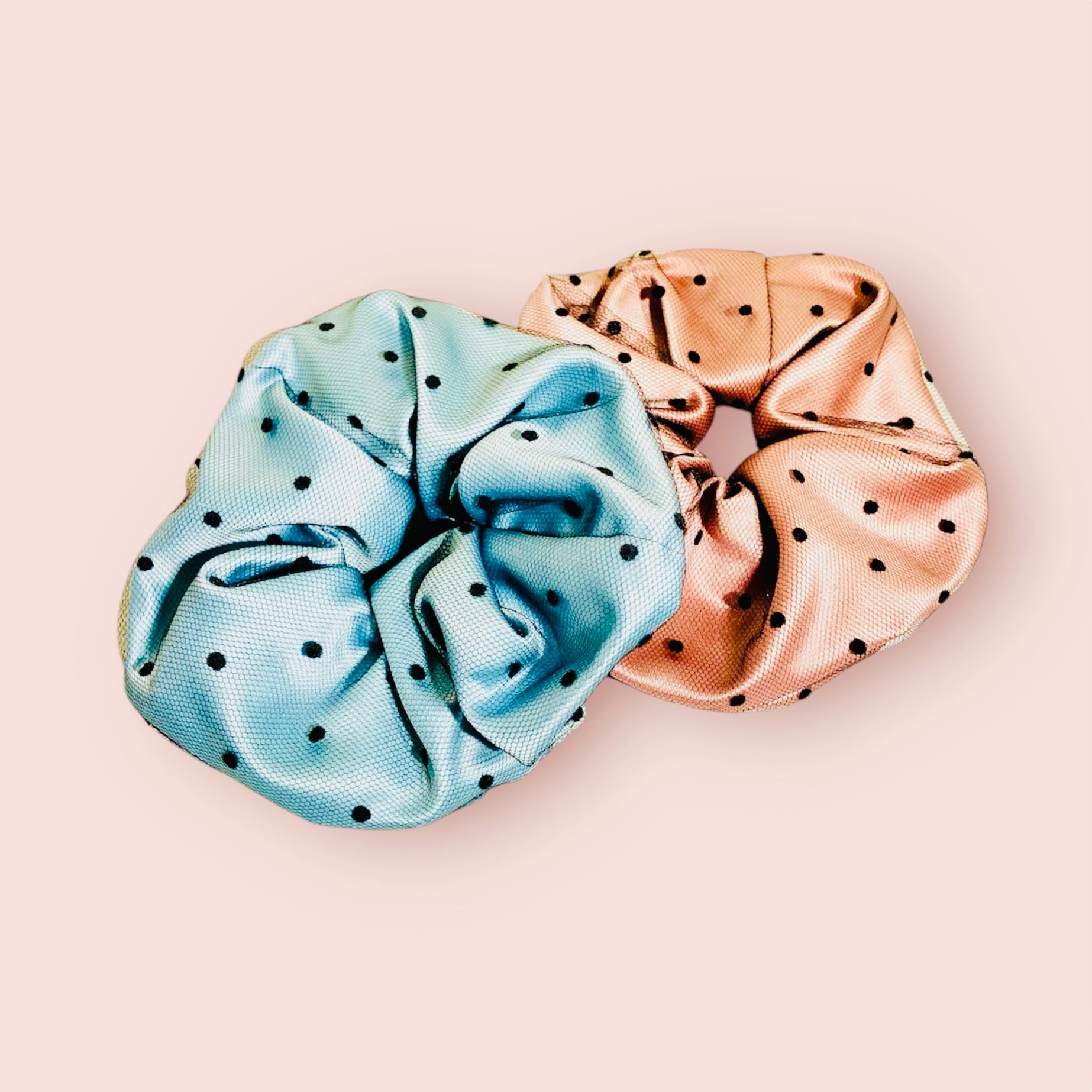 サテン生地にドット柄のチュールレースを重ねたロマンティックなシュシュ。
