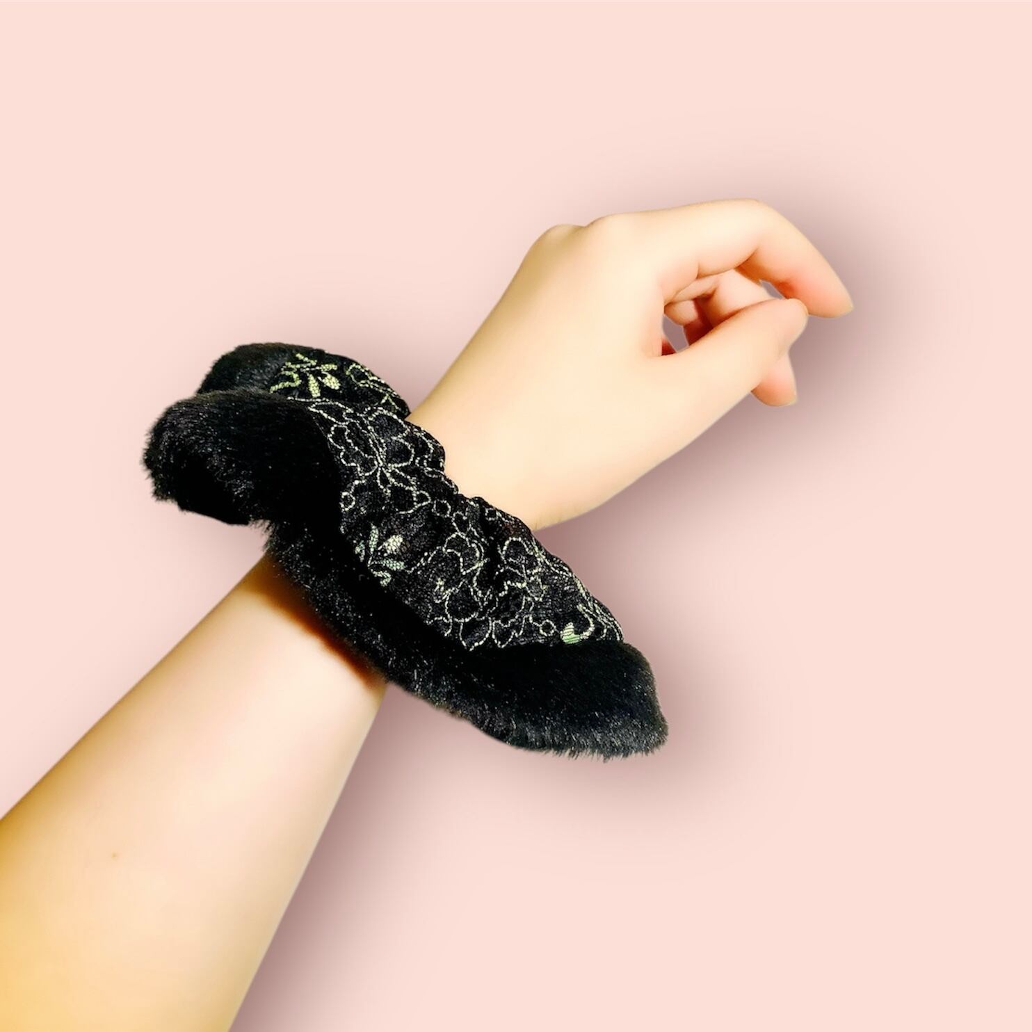 上品な毛並みのフェイクファーを華やかなレースと合わせた1点物のデザインシュシュ。