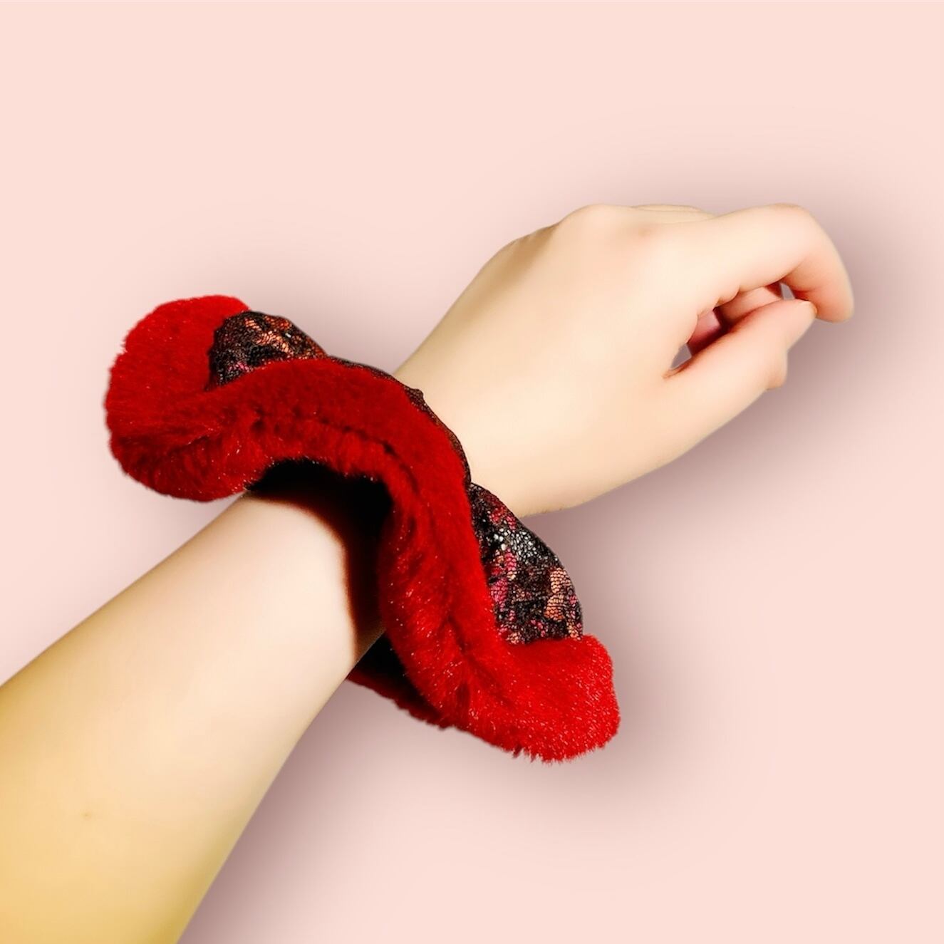 ファー部分はレッド、レースはダークブラウンに刺繍糸がオレンジ、レッドの花柄のデザインです。